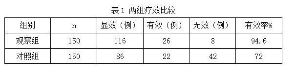 兩組總有效率經(jīng)去切概率法檢驗(yàn),P<0.05差異有統(tǒng)計(jì)學(xué)意義。觀察組的總有效率明顯高于對(duì)照組,見(jiàn)表1。